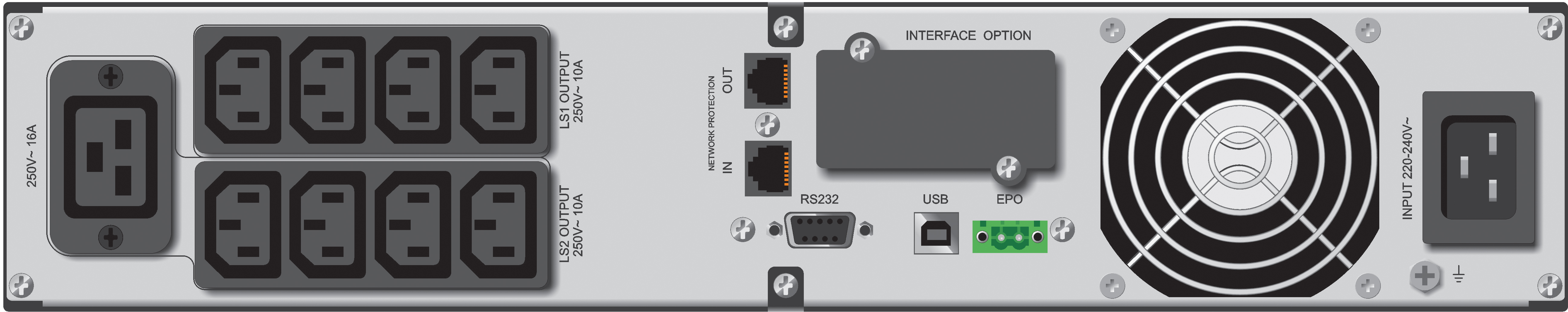 Χρόνος μεταγωγής: τυπικό 2-6 ms, μέγιστο 13 ms. Κυματομορφή: ημιτονοειδές κύμα.Προστατευτική λειτουργία: προστασία βραχυκυκλώματος και υπερφόρτωσης, προστασία μπαταρίας από υπερφόρτωση, 1x ξηρή επαφή, 1x EPO, 1x έξυπνη υποδοχή |