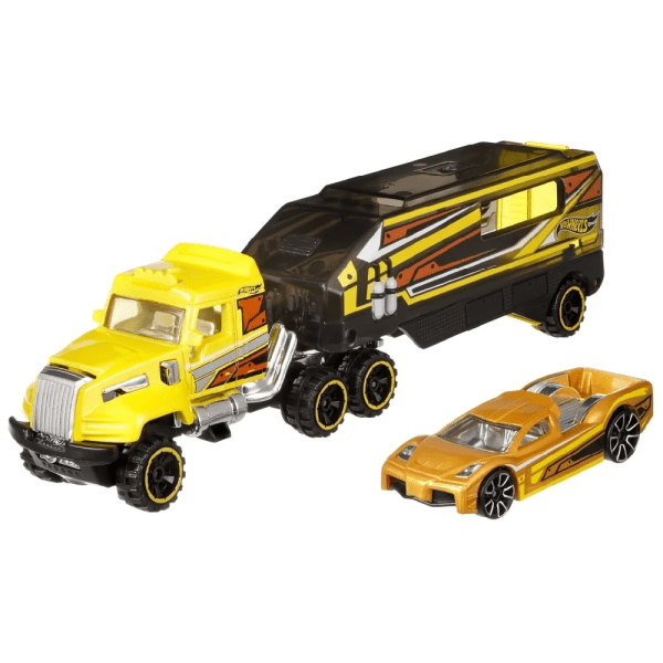 - Σπρώξτε, φορτώστε και φύγετε ή τρέξτε στην πίστα για αγωνιστικές συγκινήσεις με αυτά τα απίθανα σετ που περιλαμβάνουν φορτηγό Hot Wheels® και αυτοκίνητο!