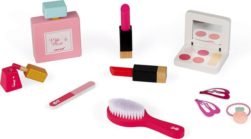 Περιλαμβάνει 10 αξεσουάρ ομορφιάς και μαλλιών: 1 βούρτσα μαλλιών, 2 τσιμπιδάκια μαλλιών, 1 λαστιχάκι μαλλιών, 1 μπουκάλι για άρωμα, 1 παλέτα μακιγιάζ, 1 λίμα νυχιών, 1 βερνίκι νυχιών, 2 κραγιόν.