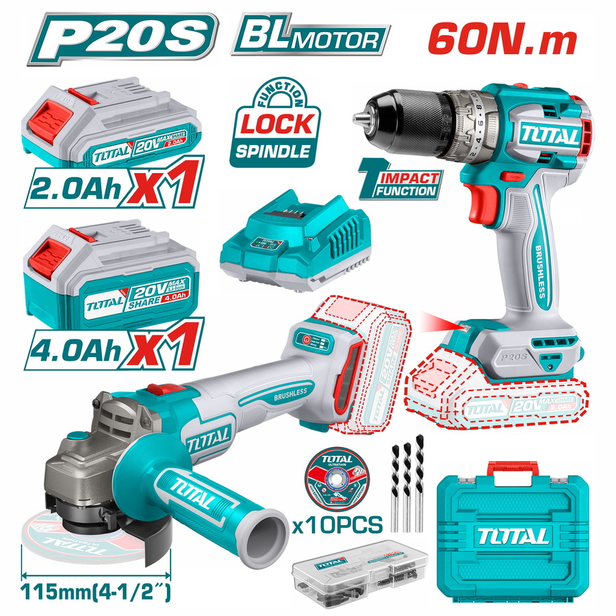 TOTAL ΕΠΑΓΓ. ΣΕΤ ΔΡΑΠ/ΒΙΔΟ ΚΡΟΥΣΤΙΚΟ + ΓΩΝΙΑΚΟΣ ΤΡΟΧΟΣ ΜΠΑΤ. Li-ion 20V / 4Ah + 2Ah (TCKLI20273E)